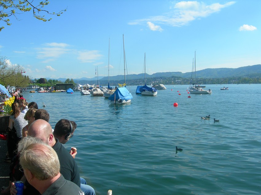 Eu am nimerit si o sarbatoare – pe 9 mai, elvetienii sarbatoresc Ziua Mamei si totul este inchis, iar cum afara ploua, orasul era destul de pustiu chiar si ziua, pentru ca seara, ca in orice comunitate cu origini germane, nu e o surpriza sa nu fie nimeni pe strada. In prima zi de sedere acolo (8 mai) am avut insa parte de o zi insorita, astfel ca malul lacului era plin de oameni care pur si simplu stateau la soare sau la cele cateva terase de pe tarm, iar pe lac pluteau de la hidrobiciclete sau barci cu vasle la iahturi si vaporase de pasageri.