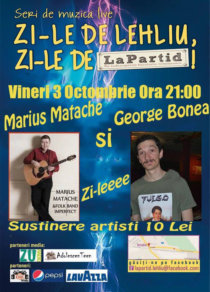 Înainte de spectacolul de la Mignon, voi onora, alături de Cristi și Radu (cei doi componenți ai Folk Band Imperfect) , invitația prietenilor de la Restaurantul La Partid din Lehliu-Gară la ce ei au numit Festivalul Zi-le de Partid. Alături de noi va presta George Bonea, responsabil cu partea de stand up comedy a spectacolului.