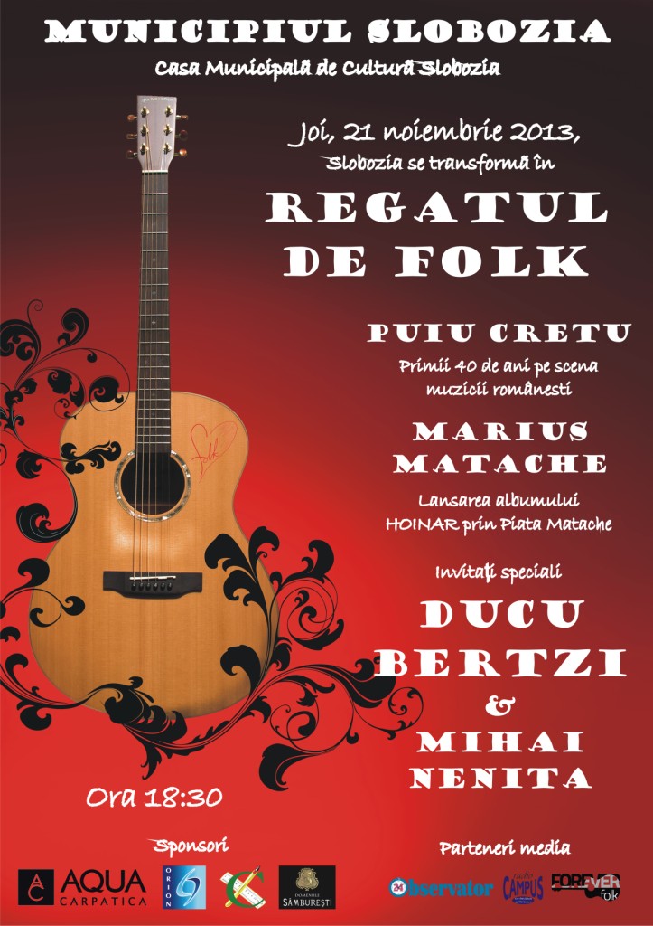 Joi, 21 noiembrie, ne vedem la Slobozia, în spectacolul Regatul de Folk, ce va avea loc la Casa Municipală de Cultură, începând cu ora 18:30. Spectacolul este unul foarte special, fiind dedicat, pe de-o parte aniversării a 40 de ani de carieră muzicală de către prietenul Puiu Crețu, iar pe de altă parte lansării albumului meu HOINAR prin Piața Matache. Avem și doi invitați speciali cu această ocazie, pe Ducu Bertzi și Mihai Neniță. Iar pentru acest spectacol trebuie să mulțumesc Primăriei Slobozia, care s-a gândit și la mine și la Puiu.