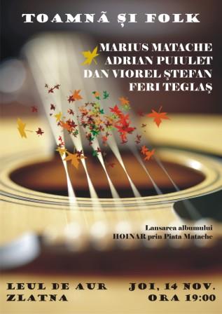 Ca o avanpremieră la Festivalul Ziua de Mâine de la Alba Iulia, joi, 14 noiembrie, voi merge să lansez albumul HOINAR prin Piața Matache la Zlatna. În locația numită Leul de Aur, voi cânta alături de Adi Puiuleț, Feri Teglaș și Dan Viorel Ștefan.