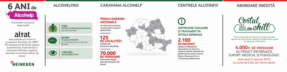 Colaborarea dintre Heineken și ALIAT (Alianța pentru Lupta Împotriva Alcoolismului și Toxicomaniilor) a împlinit 6 ani și s-a materializat într-o serie de proiecte complexe menite să prevină și să trateze abuzul de alcool. Peste 70.000 de persoane au fost informate cu privire la riscurile implicate de consumul de alcool. Sinteza acestor proiecte o găsiți în infograficul de mai jos.