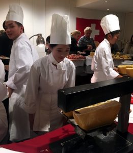 Mai multe bucătării – japonez, tradițional elvețian cu raclette (foto dreapta) și cheese fondue, plus mezeluri tradiționale, braserie cu burgeri și alte cărnuri stropite cu bere făcută chiar de studenți, din nou bucătărie asiatică (am gustat un porc delicios din Hong-Kong). Grădina Secretă ne aștepta cu prăjituri – macaroons, tiramisu, creme brule și multe alte nebunii, dar și un atelier de cafea.
